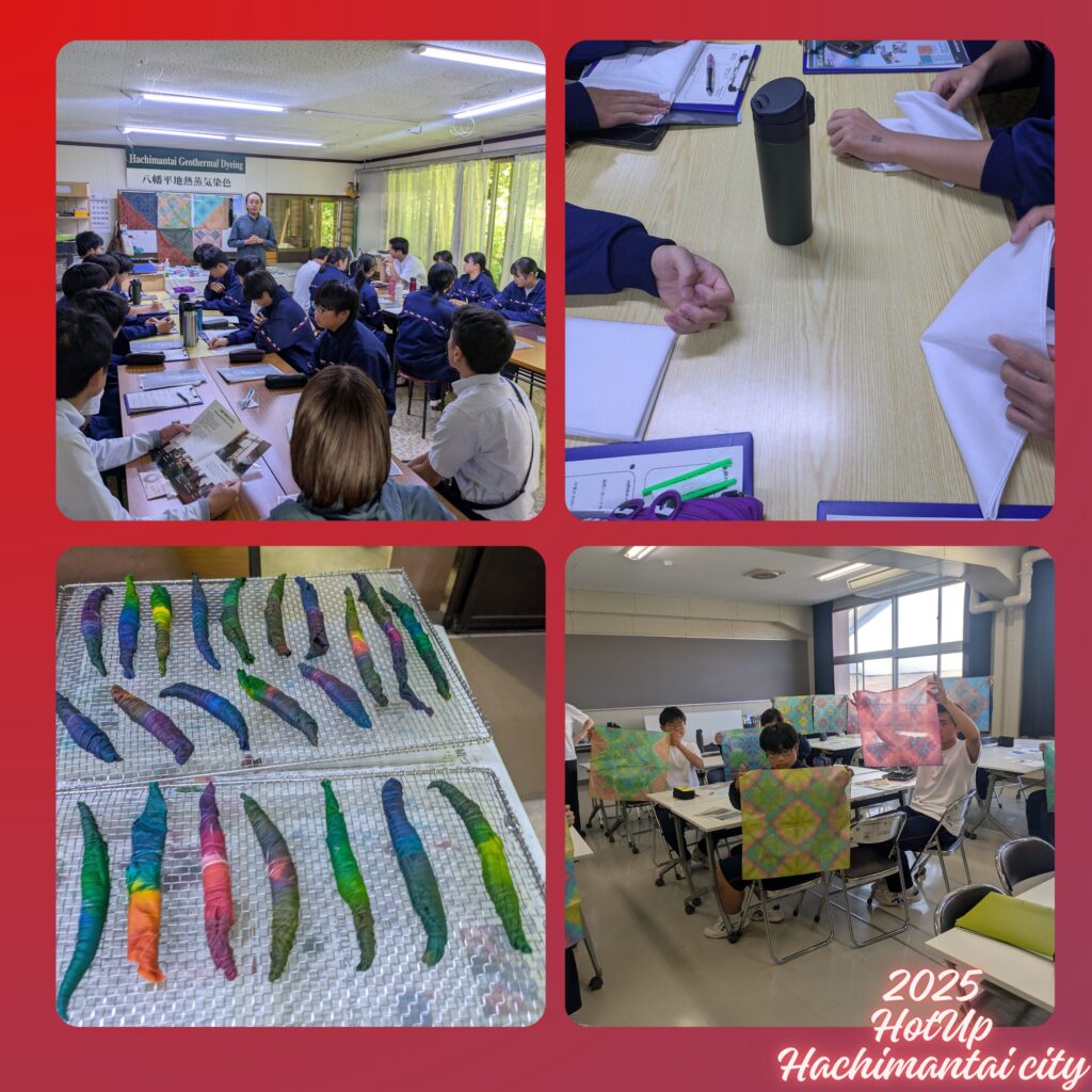 染色作家の方からは、松川温泉の歴史や、地熱発電との深い関わり、そして染物への繋がりについてのお話もあり、生徒たちは地域の文化とエネルギーの結びつきに理解を深めました。約20分間の蒸し上げ時間も、作家さんとの交流を図る貴重な時間となりました。