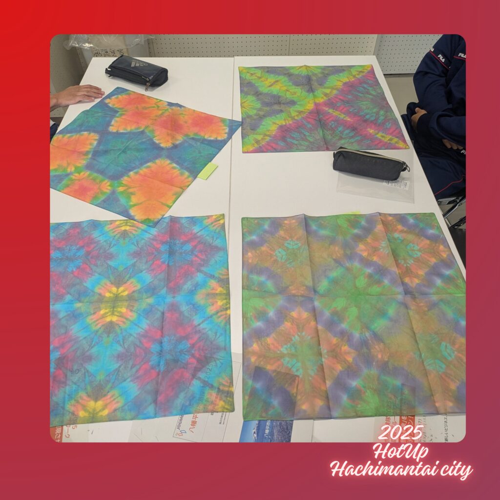松川地熱発電所から出る地熱蒸気の熱と、その中に含まれる成分を活用して、美しいグラデーションに布を染め上げる「地熱染め」です。地元高校の生徒ですが、ほぼ全員が初めての挑戦でした!